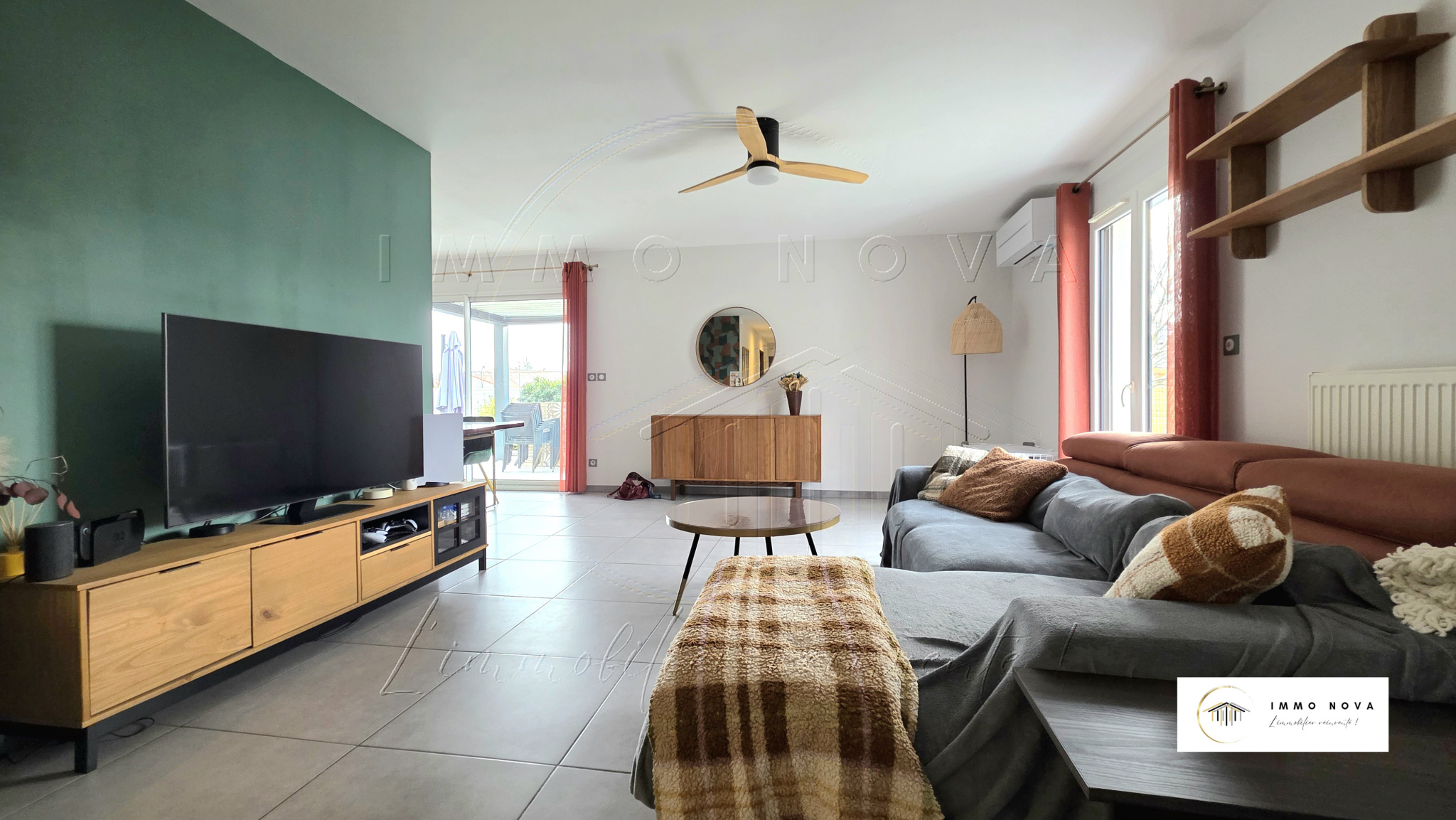 Belle pièce de vie lumineuse avec cuisine ouverte, prolongée par un cellier