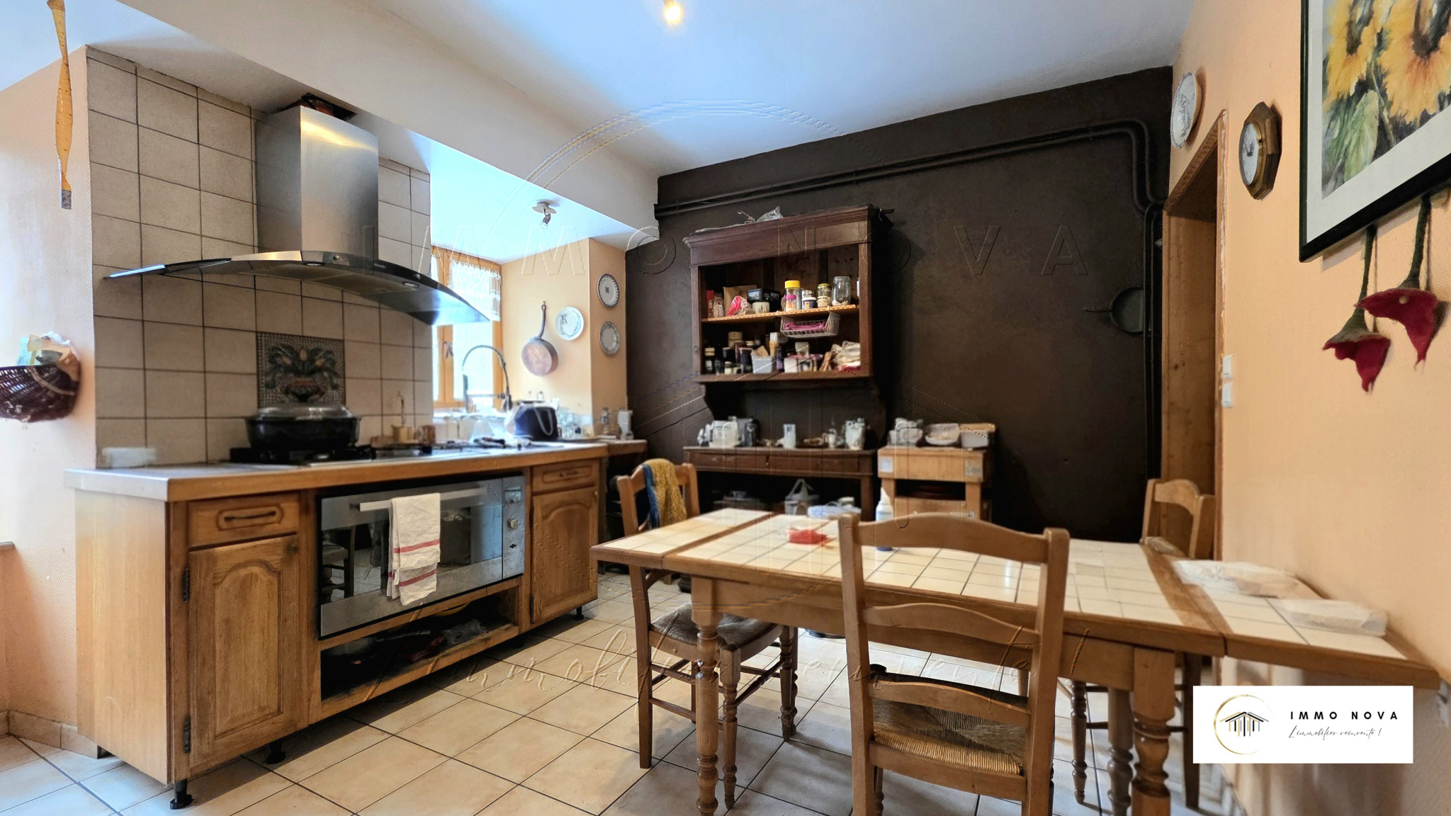 La cuisine, généreuse avec ses 26 m², dispose d’un cellier attenant de 14 m², offrant un réel confort au quotidien.